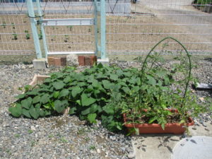 子ども達は小さなじょうろで一生懸命お水をあげながら「おおきくなった?」「きゅうりはまだ?どこにできるかなぁ?」と不安と期待を入り混ぜながら成長を観察…♪