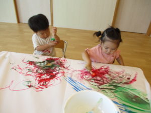 いろいろな素材を使った感覚遊びは、子どもたちの興味や関心を引くだけでなく、触覚はもちろん視覚や嗅覚などの五感を刺激するにもぴったりです♪それぞれの年齢に合わせながら、まだまだ続きそうな暑い日々を楽しく乗り越えていきたいと思います(^_-)-☆