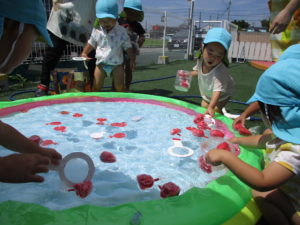 すべり台付きのプールや噴水型のプールも大好きだけど、今日はみんなで≪金魚すくい遊び≫をしました🐠